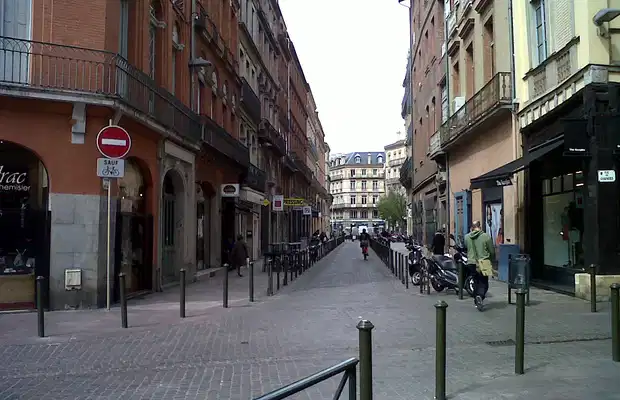 Aux abords de la rue de Metz, grande rue haussmannienne du 19ème siècle, en rejoignant la place de la Trinité, la rue des marchands se distingue essentiellement par un immeuble situé au numéro 28. Douze cariatides sculptées dans la pierre trônent fièrement au premier étage contrastant avec la brique utilisée pour le reste du bâtiment. On doit cette magnifique réalisation à l'architecte toulousain Auguste Virebent, aux alentours du mileu du 19ème siècle.