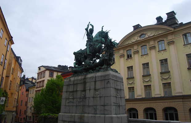 Il s'agit d'une réplique de la sculpture en bois que l'on retrouve dans la cathédrale réalisée par Bernt Notker, l'artiste allemand qui a vécu à Stockholm pendant quelques années. Cette statue en bronze a été mise en place en 1912.