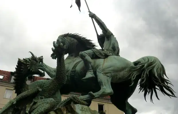August Kiss est l’auteur de cette statue et mémorial de Saint George. Le chevalier est représenté en taille réelle, c’est un modèle qui a été présenté a Paris a l’exposition universelle de 1855, où elle a gagné un prix. Mais le soir où ils devaient la remmener, Kiss est mort. Sa veuve a donné la statue aux rois de Prusse, a condition qu’elle soit mise en valeur. La statue de St Jorge et le dragon a commencé dans la cour du palais de la ville, jusqu’a sa destruction dans les années 50. Le palais était trop endommagé par les bombardements de la guerre, et il représentait la Prusse. La statue a été transportée dans le parc de Friedrichshain jusqu’a la rénovation du quartier de Nikolaiviertel.