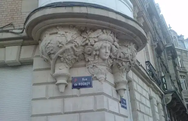 Si vous passez par la Porte de Paris, je vous invite à jeter un œil au bâtiment qui fait l'angle de la place Simon-Volant et de la rue de Rocroy. Vous pourrez, avec autant de plaisir que moi je l'espère, apprécier de magnifiques bas-reliefs ornant la façade et notamment la fenêtre qui forme elle-même un élégant relief arrondi sur le coin. Difficile de voir ce que représente ces simples décorations de style néo-classiques mais je suis fasciné par ce visage de femme impassible et cerné de branchages.