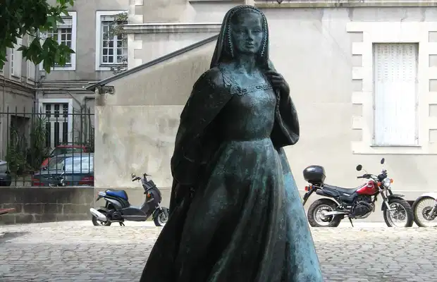 Cette statue de Jean Fréour est située sur une petite place, juste à côté de l’entrée principale du château des Ducs. Elle représente Anne de Bretagne, personnage historique de la fin du XVe et du début du XVIe siècle, qui eut un rôle fondamental non seulement en Bretagne mais aussi en France à laquelle elle permettra le rattachement de son duché d’origine par son mariage. Elle fut ainsi entre autre duchesse de Bretagne mais aussi deux fois reine de France. Sa statue semble en plein mouvement, le regard dirigé vers le Château, à même le sol sans socle, ce qui renforce cette impression de la voir