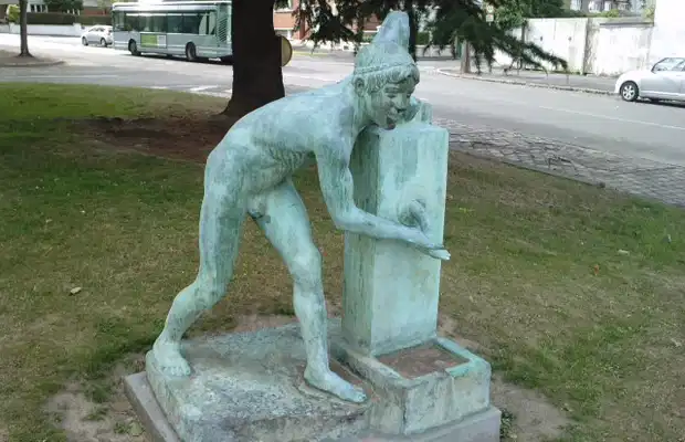 A deux pas du square Plumecocq, sur un petit monticule d'herbe entre deux avenues, on a élevé une petite statue qui contraste assez vivement avec l'urbanisation environnante. Elle représente un jeune homme nu, rieur, qui vient chercher de l'eau à une fontaine. Cette sculpture me plaît car elle est pleine de vie, notamment grâce à la position très expressive de ce jeune homme, sa façon de se pencher avec vivacité, comme s'il ne passait qu'en coup de vent chercher un peu d'eau, avant de retourner dans un autre monde, le sien, que j'imagine plus bucolique, moins urbain...