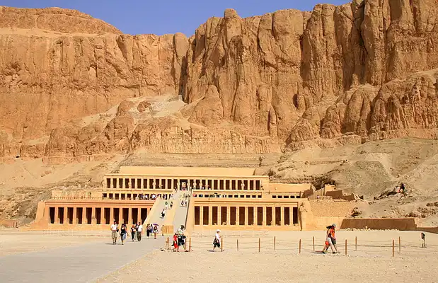 Dans un site remarquable : amphithéâtre de montagnes arides sous un ciel sec, le temple funéraire de la reine Hatchepsoup est dédié au dieu Amon, mais aussi aux dieux Anubis et Hathor (déesse du plaisir et protectrice des femmes).