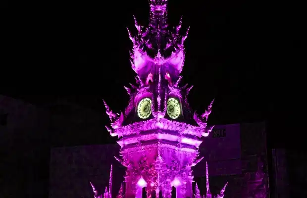 La Tour de l'Horloge à Chiang Rai n'est rien de plus qu'une tour, qui se trouve à l'intersection de deux rues plus ou moins grandes, sur un rond-point. Cette tour est très décorée, toute dorée, avec une horloge sur le dessus. Dans la soirée, elle fait un "spectacle de son et lumière". Autrement dit, il a des poches de différentes couleurs, qui changent et qui mettent un peu de musique de fond thaïlandaise unique. Cela dure pendant environ dix minutes, à l'heure à partir de 18h00 (je crois) et 22h00. Bien que personne n'y prête beaucoup d'attention, à l'exception des touristes comme moi, nous avons passé ces heures là-bas.