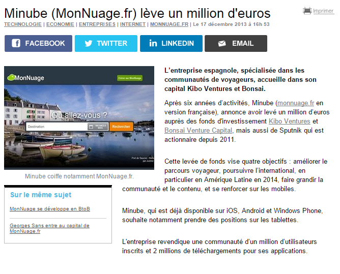 Le réseau social de voyageurs Minube (Monnuage.fr) lève 1 million d'euros